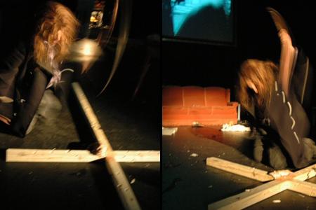 Meese wendet sich an das gut besuchte Auditorium und fordert mehr Demut und Liebe. Auch gegenüber Richard Wagner, der mit seiner Musik keinesfalls quälen wolle, auch gegenüber Hagen, mit dem er eine in künstlerischen Maßstäben homoerotische Beziehung pflegt. "Laßt die Musik von Wagner sich selbst lieben." Meese redet sich zunehmend in Rage. Schreit, gestikuliert, grimassiert. Wieder fährt er Grassmann ins Wort, die noch als einzige dagegenhält. Elfenforscherin und Co-Repetitor, ja sogar Schlingensief zieht sich zurück. Mit Schaum vorm Mund, hinter gelben Brillengläsern und dem talibanen Bart performt Meese sich in Trance, jedenfalls wirkt der Veitstanz zunehmend authentischer. Sein Auftritt oszilliert zwischen Wahn und Weisung. Der Radikalität seiner Heroen stellt er die Passivität des Publikums gegenüber. Mit dessen "Befindlichkeitsterrorismus" mag Meese nichts zu tun haben. Seine Forderung "Wir müssen aufrüsten und selber an die Kunstfront, denn da stirbt gerade das Leben" stimmt nachdenklich. Nach Ende der Fickcollection (Bild) und Meeses Performance (Bild im Bild) saß man selbst ) - ausgestattet mit Sitzkissen und Wolldecke - mit der "Fratze der Harmlosigkeit" im Zuschauerraum.