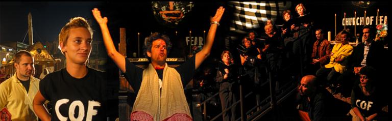 Christoph Schlingensiefs CHURCH of FEAR dehnt den sektiererischen Gedanken auf federführende, d.h. Meinung, d.h. Glauben machende Systeme aus. Von zentraler Bedeutung ist das Verständnis systembestimmender Interessengruppen: die Fernsehshow als Messfeier, die politische Stallorder als Gebot, die Richtlinien der New Economy als apokryphe Schrift. Charakteristische Gemeinsamkeit ist die interne Produktion von Wortführern, Propheten-gestalten und Heilsbringern, ihren Heilsversprechen und Botschaften. Inmitten der modernen, sich permanent und radikal wandelnden Gesellschaft stellen sie schon fast regelmäßig den wenig tauglichen Versuch dar, ihren Anhängern paradiesische, schmerzfreie Zustände zu prognostizieren. Dabei hilft ihnen der Rückgriff auf vermeintliche Offenbarungen oder neuzeitliche Evangelien, die zum Großteil Erfindungen und bloße Irreführungen sind.